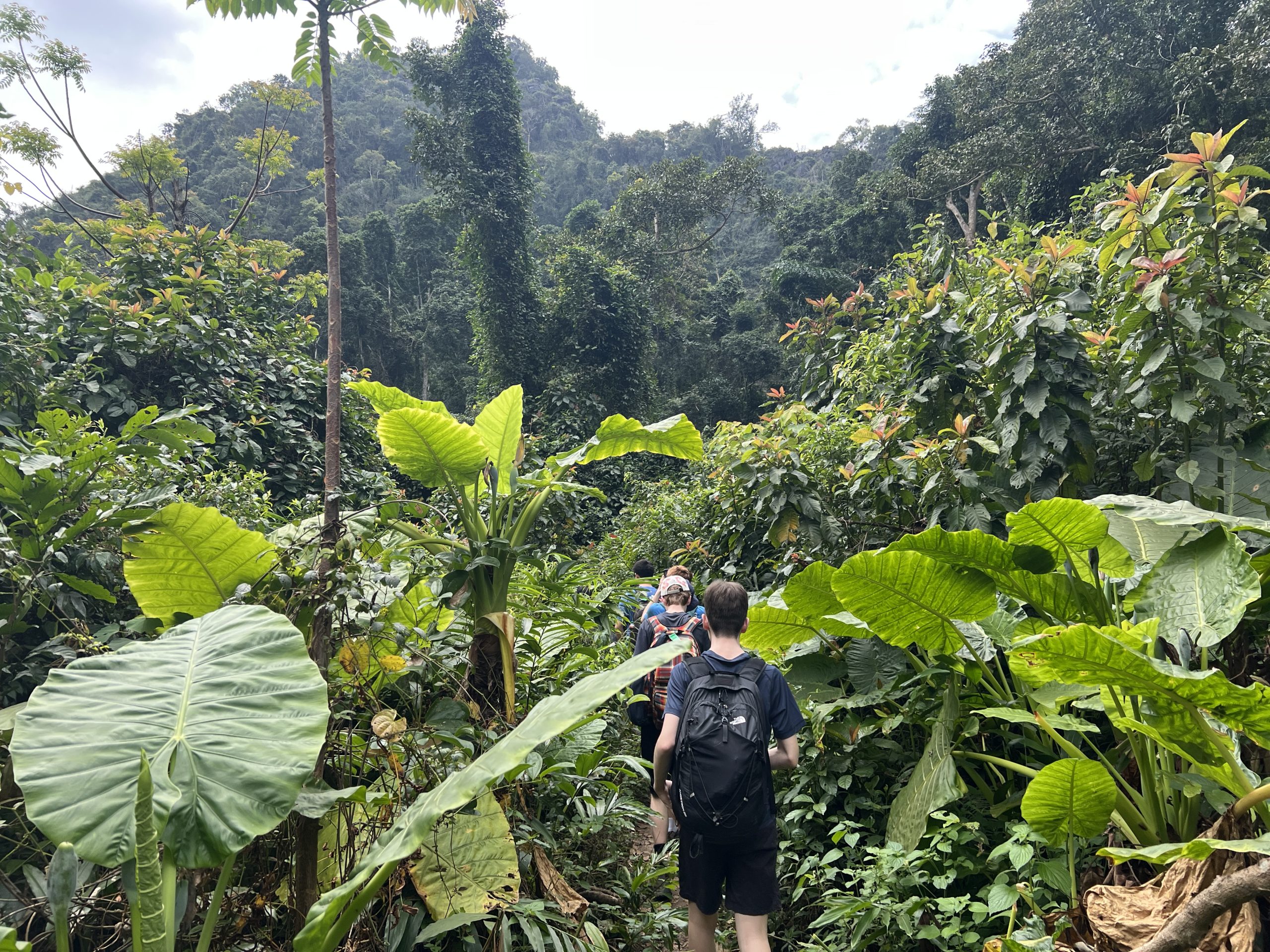 We climbed up, climbed down, walked deep through the jungle, and crossed limestone valleys, over and over again. Along the way, we were surrounded by countless butterflies, the constant sounds of chirping insects, and more lush flora than one could imagine. Some of the leaves were so large that they could have covered an entire person.