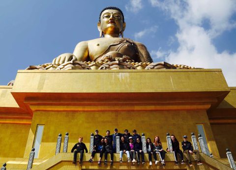 We started our day at 8:00am for breakfast and then headed straight to the National Memorial Chorten, which is one of the most visible religious structures in Thimphu. We wandered around for about half an hour looking at and into the Chorten, walking clockwise around the building with other worshippers as they quietly chanted and counted their prayer beads. We spun prayer wheels and listened to music by the monks that was flowing out of a nearby temple. We found it very interesting that there are no retirement homes in Bhutan. Instead, the grown children of the elderly drop their parents off at the Chorten where they spend their days praying and chanting. Their elder years provide them an opportunity to pray and prepare themselves for their hope of reincarnation. Afterwards, we headed to Buddha Point, where we saw the largest sitting Buddha in the whole world! It is made of steel and painted gold. It sits 50 meters tall.